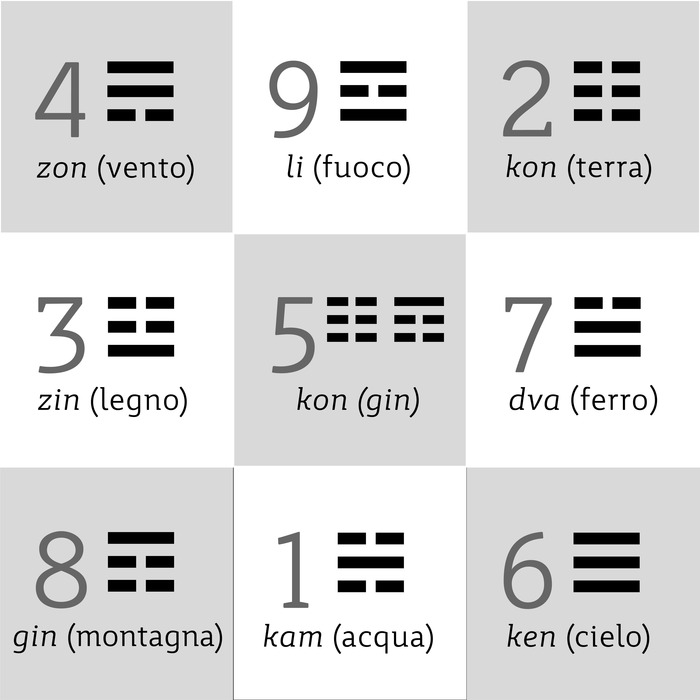- Il 5 al centro non è legato ad alcun trigramma nella presentazione classica cinese. L'astrologia tibetana ripete ☷ kon-terra in questo punto per gli uomini e ☶ gin-montagna per le donne nei calcoli matrimoniali, che saranno descritti tra poco. Questo valore del trigramma per il 5 al centro, diverso per uomini e donne, è lo stesso che si trova nel sistema astrologico classico cinese dell'I Ching.