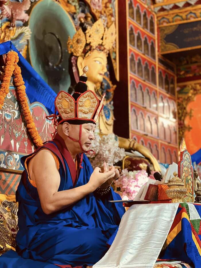 In 2017, His Holiness the 33rd Menri Trizin passed away, and a successor needed to be found. With advice from His Eminence Yongzin Rinpoche, His Eminence Menri Lopon Trinley Nyima Rinpoche led the process. It was decided that the new Menri Trizin should be appointed outside of Tibet so that he could stand alongside the other Tibetan religious leaders. Letters were sent to more than 100 geshes, and after many withdrew, about 60 took part in a sign examination looking for auspicious signs. In the end, my name came out.