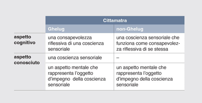 Possiamo illustrare alcune delle principali differenze tra le presentazioni ghelug e karma kagyu della consapevolezza riflessiva con il seguente grafico riguardante la cognizione sensoriale non concettuale.